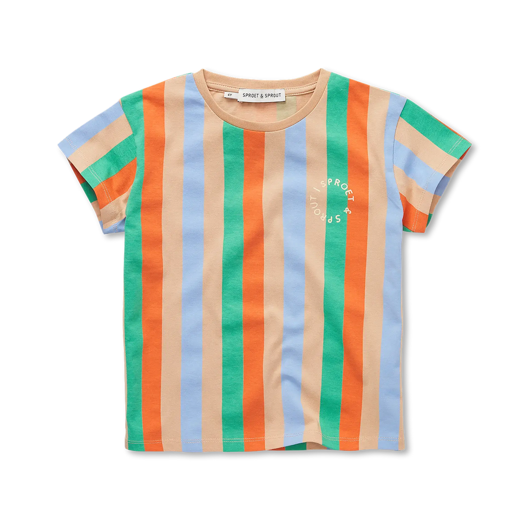 Deze t-shirt voor jongens van Sproet & Sprout is een zomerse klassieker met een speelse twist. Het verticale streeppatroon in zand, groen, oranje en blauw geeft de t-shirt een frisse, sportieve uitstraling die nooit uit de mode raakt.