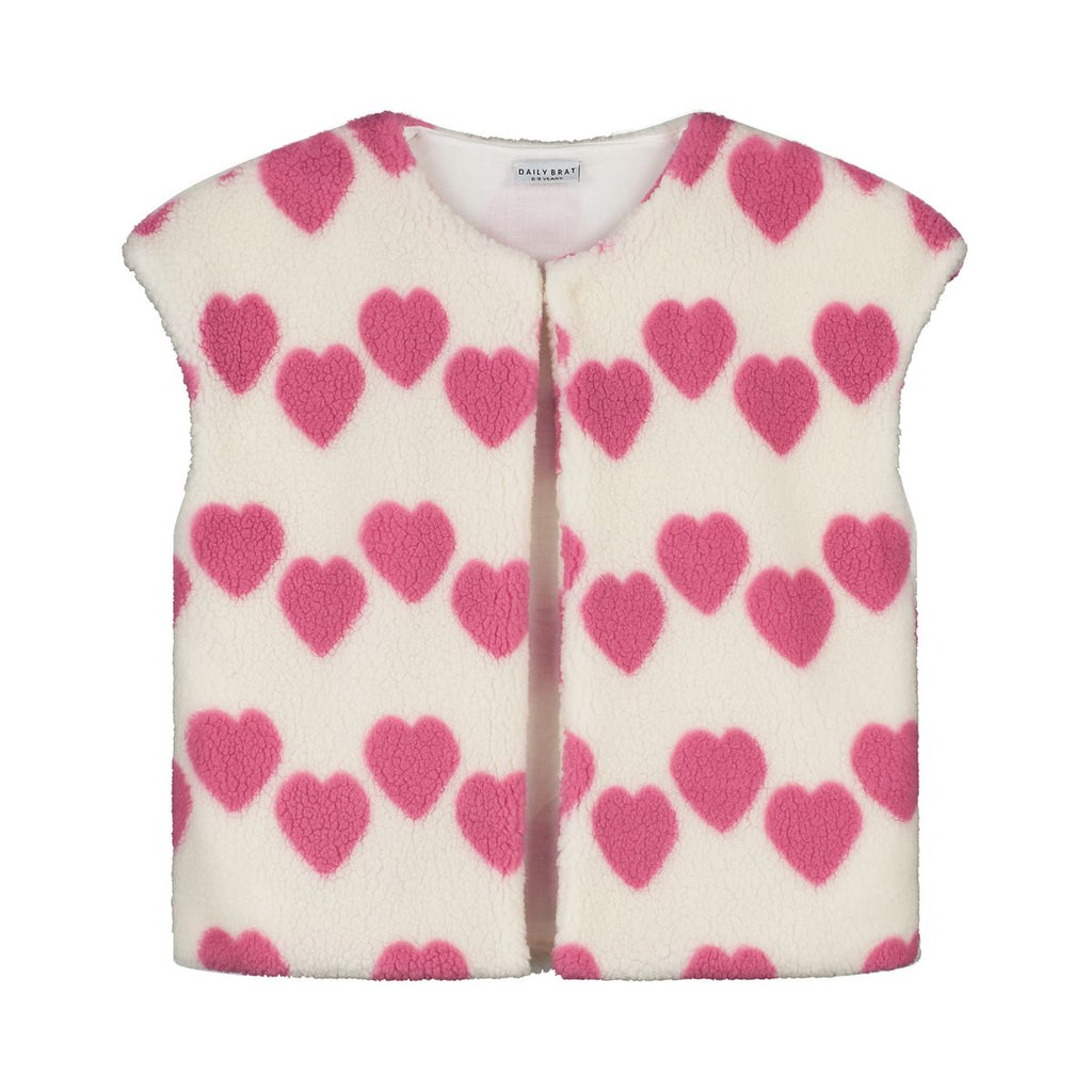 Deze witte teddy bodywarmer met roze hartjes van Daily Brat is een echte blikvanger uit de City Notes collectie. Het mouwloze ontwerp is gemaakt uit superzachte teddy stof en voelt heerlijk warm aan.